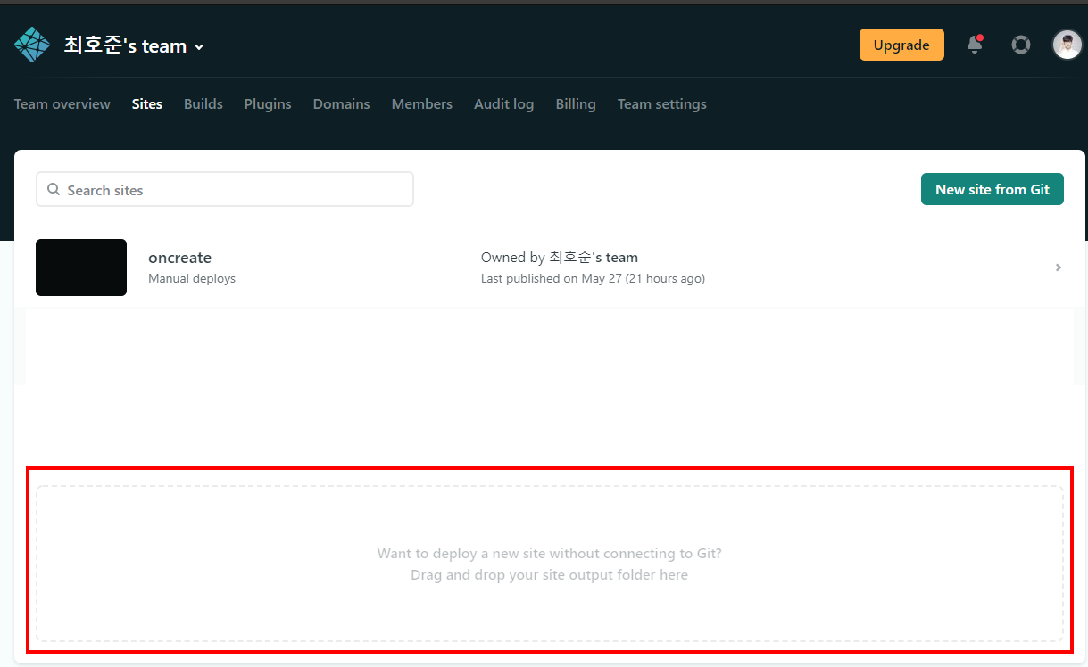 우측 하단의 New site from Git을 통해, Git에 올려둔 사이트를 연결할 수 있습니다. 한 번 연결하면 변경 내용이 Git에 반영될 때마다 자동으로 재 배포해줍니다.